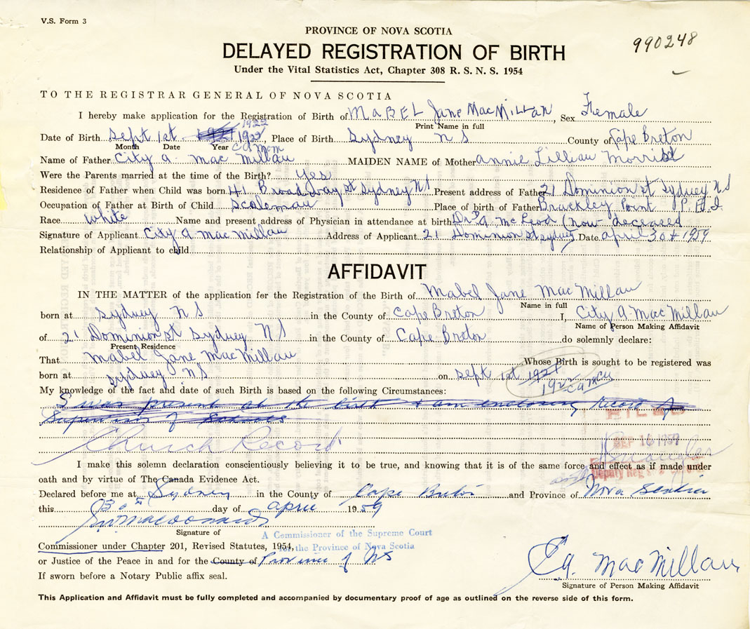 I hereby make application for the Registration of Birth of Mabel JaneMacMillan Sex Female