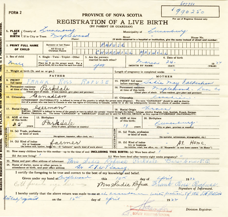 I hereby make application for the Registration of Birth of Maxwell ChurchillRafuse Sex Male