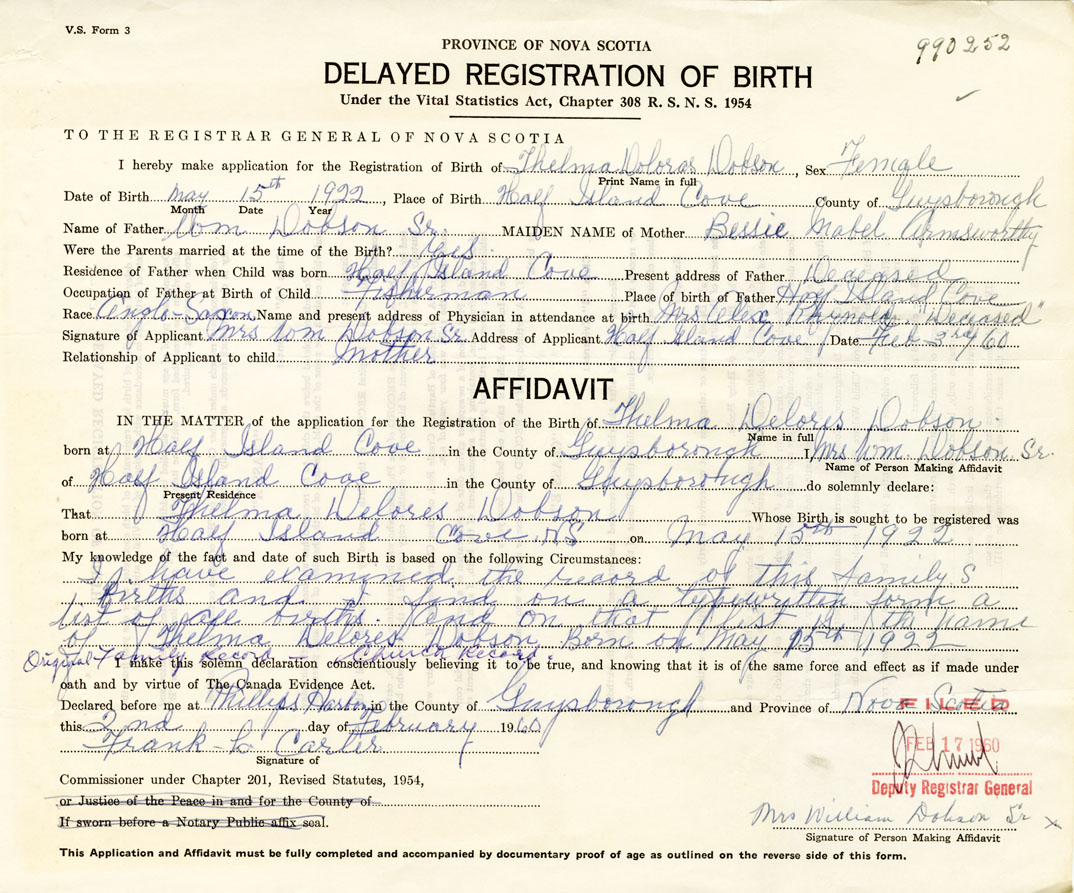Date of Birth May 15, 1922 Place of Birth Half Island CoveCounty of Guysborough