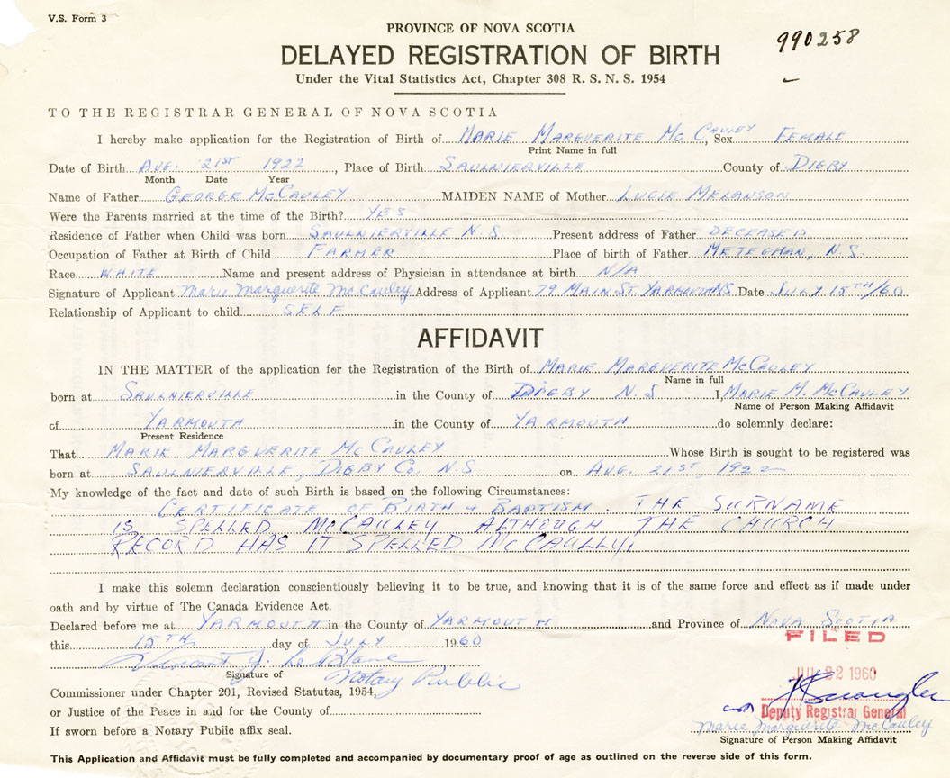 Signature of Applicant Marie Marguerite McCauley Address of Applicant 79 Main Street, Yarmouth Date 15 July 1960