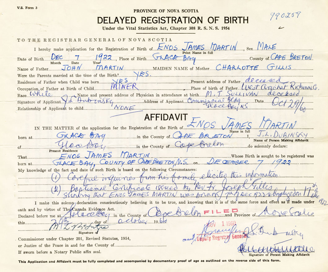 1. Careful inquiries from his family elicited this information. 2. Baptismal certificate issued by Rev. Fr. Joseph Gillis, stating that Enos James Martin was born on 7th of December 1922 and baptized on 17th of December 1922.