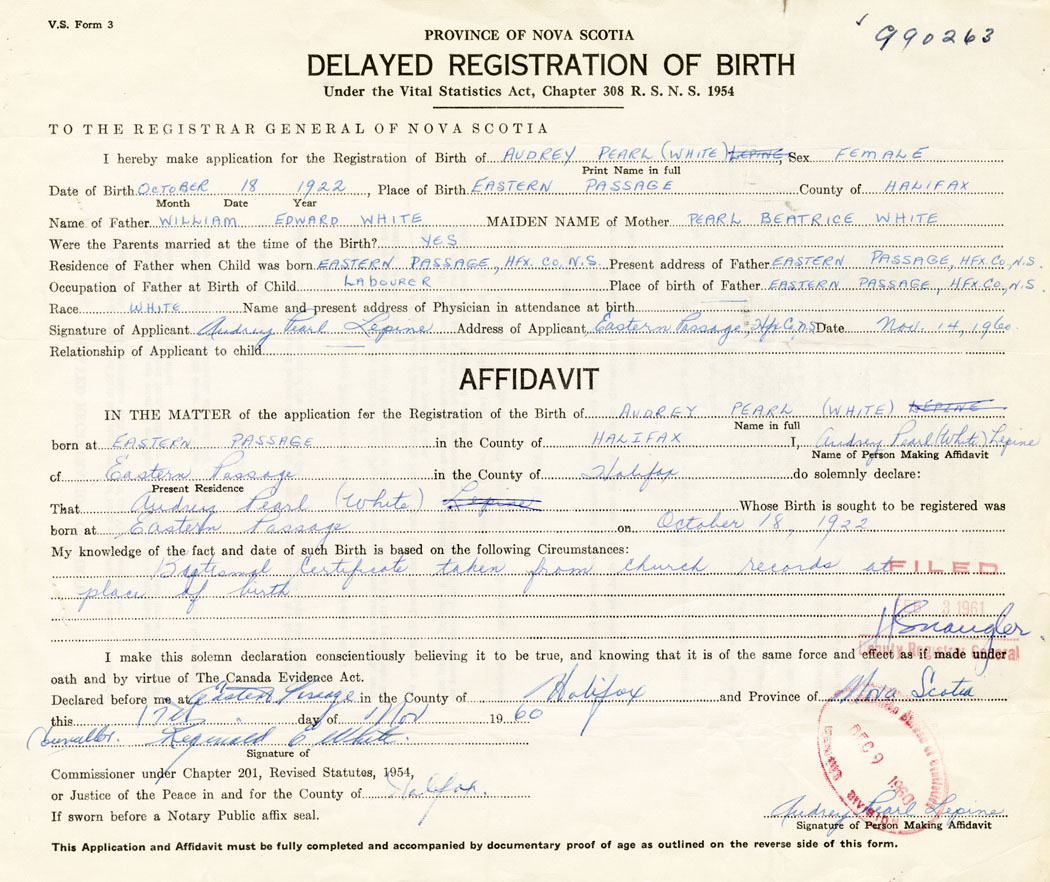 Signature of Applicant Audrey Pearl Lepine Address of Applicant Eastern Passage, Halifax Date 14 November 1960