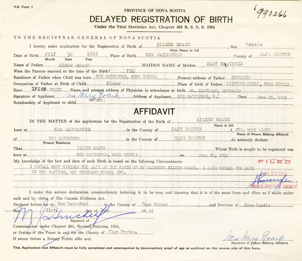 Signature of Applicant Mrs. Mary Roach Address of Applicant New Waterford, Cape Breton Date 21 June 1961