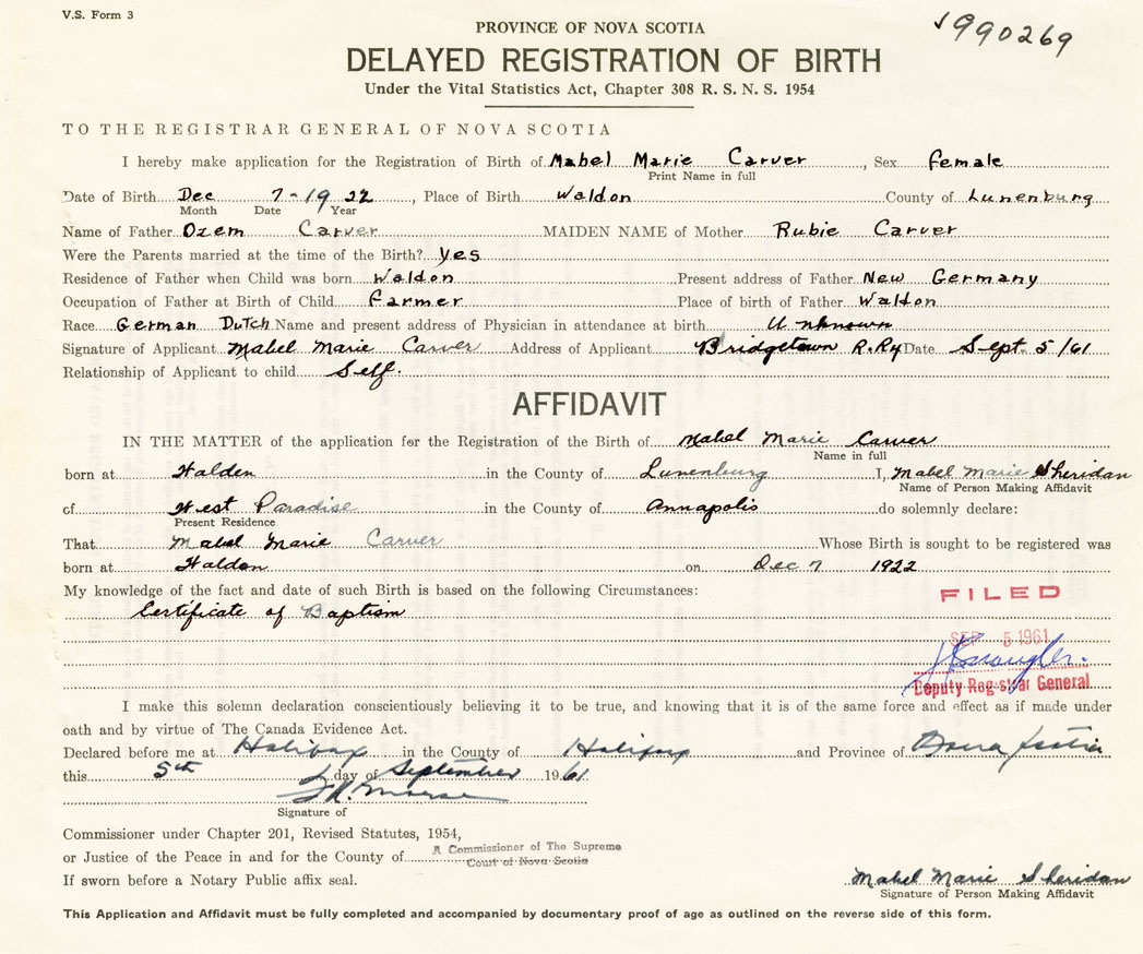 Signature of Applicant Mabel Marie Carver Address of Applicant RR #4, Bridgetown, Annapolis Date 5 September 1961