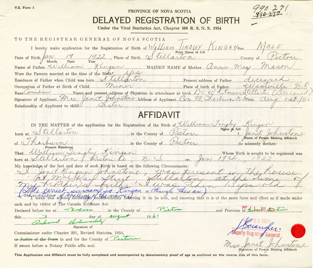 I Janet Kingan Johnstone, was present in the house at MacKay Street, Stellarton at the time of my brothers birth. I was then 13 years old. (The correct surname is Kingan although there are variations of spelling of the name)