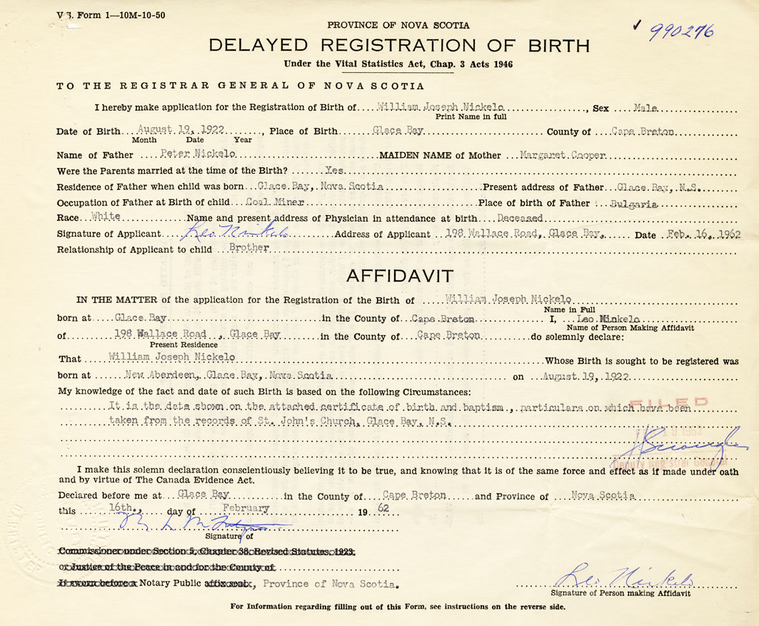 Signature of Applicant Leo Nickelo Address of Applicant 198 Wallace Road, Glace Bay, Cape Breton Date 16 February 1963
