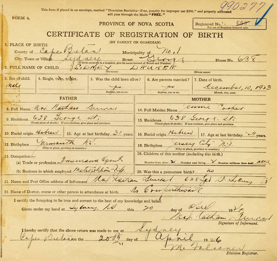 I hereby make application for the Registration of Birth of SidneyDruker Sex Male