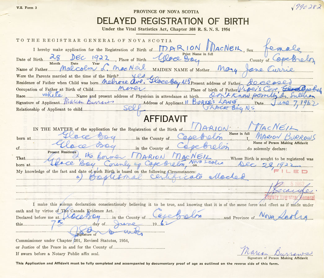 Signature of Applicant Marion Burrows Address of Applicant 11 Burkes Lane, Glace Bay, Cape Breton Date 7 June 1962