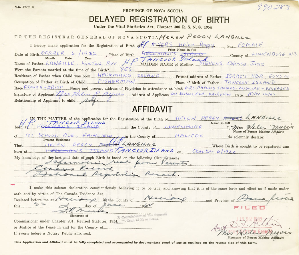 I hereby make application for the Registration of Birth of Helen PeggyLangille Sex Female
