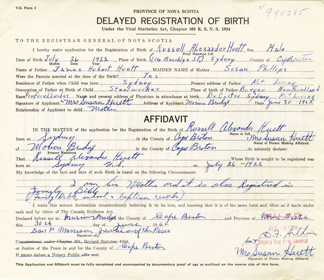 Date of Birth July 26, 1922 Place of Birth SydneyCounty of Cape Breton