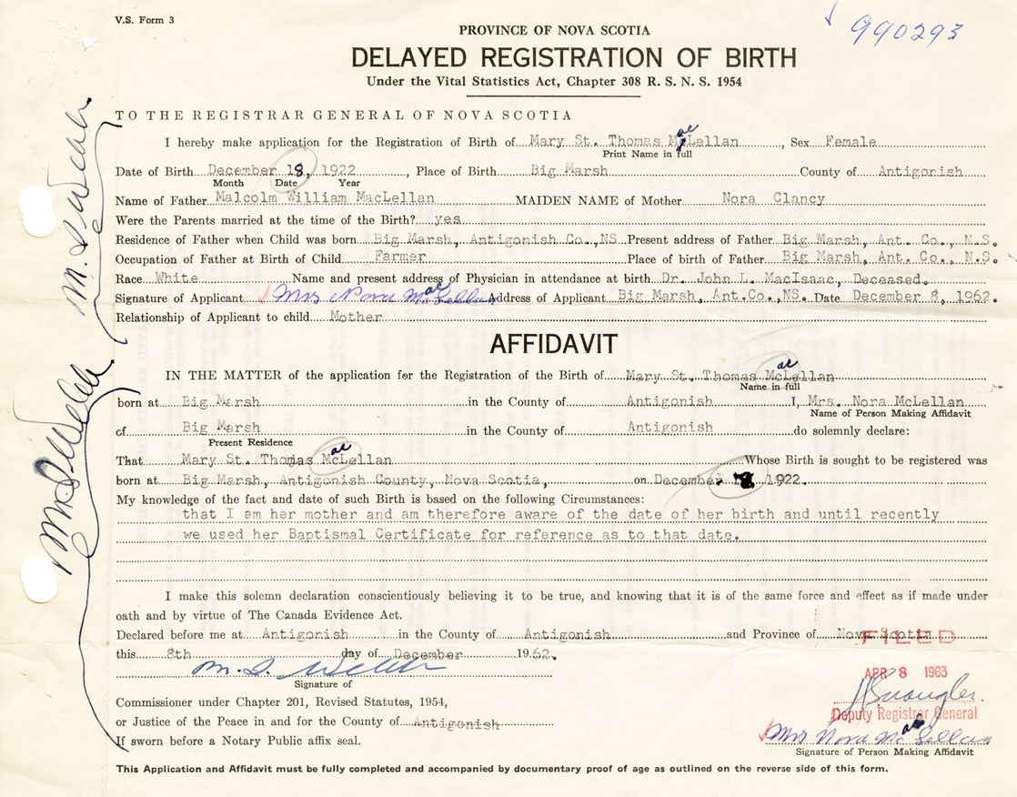 I hereby make application for the Registration of Birth of Mary St. ThomasMacLellan Sex Female