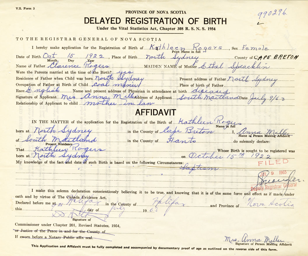 I hereby make application for the Registration of Birth of KathleenRogers Sex Female
