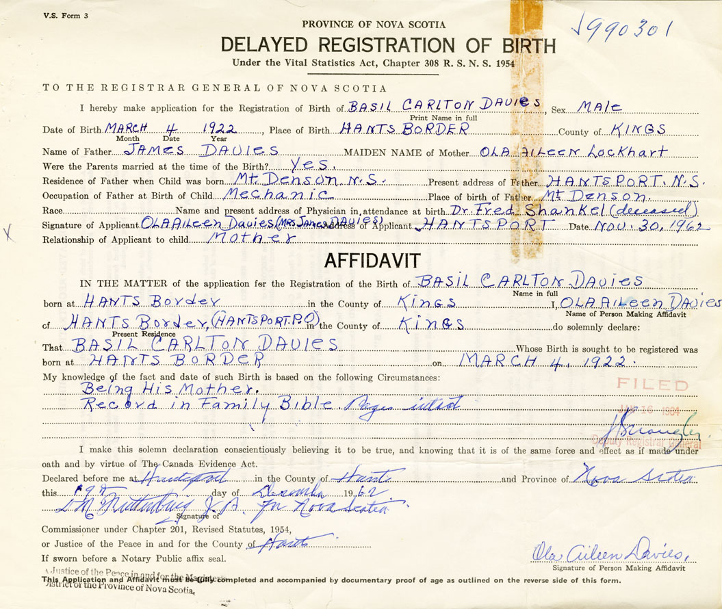 Date of Birth March 4, 1922 Place of Birth Hants BorderCounty of Kings