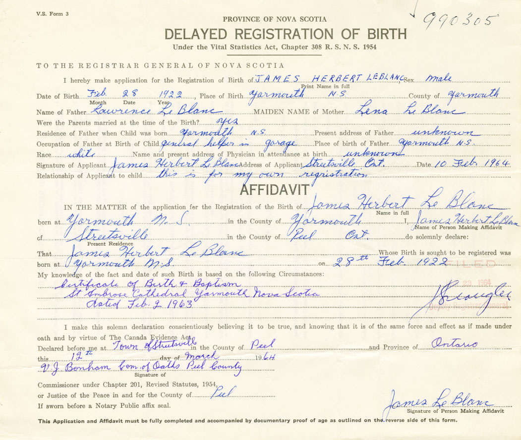 I hereby make application for the Registration of Birth of James HerbertLeBlanc Sex Male