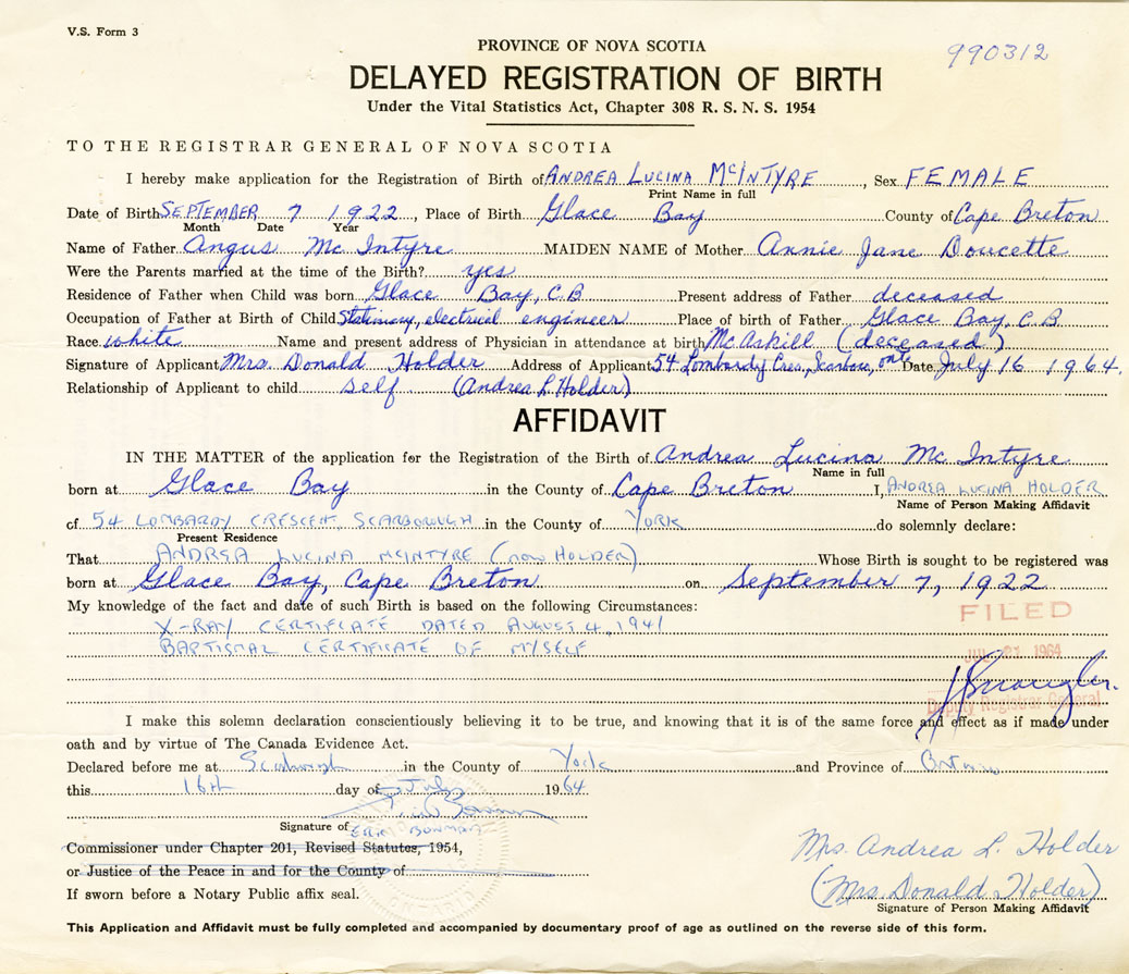 Signature of Applicant Mrs. Donald Holder Address of Applicant 54 Lombardy Crescent, Scarborough, Ontario Date 16 July 1964