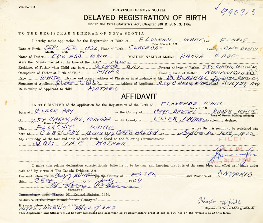 Signature of Applicant Rhoda White Address of Applicant 354 Caron, Windsor, Ontario Date 29 July 1964
