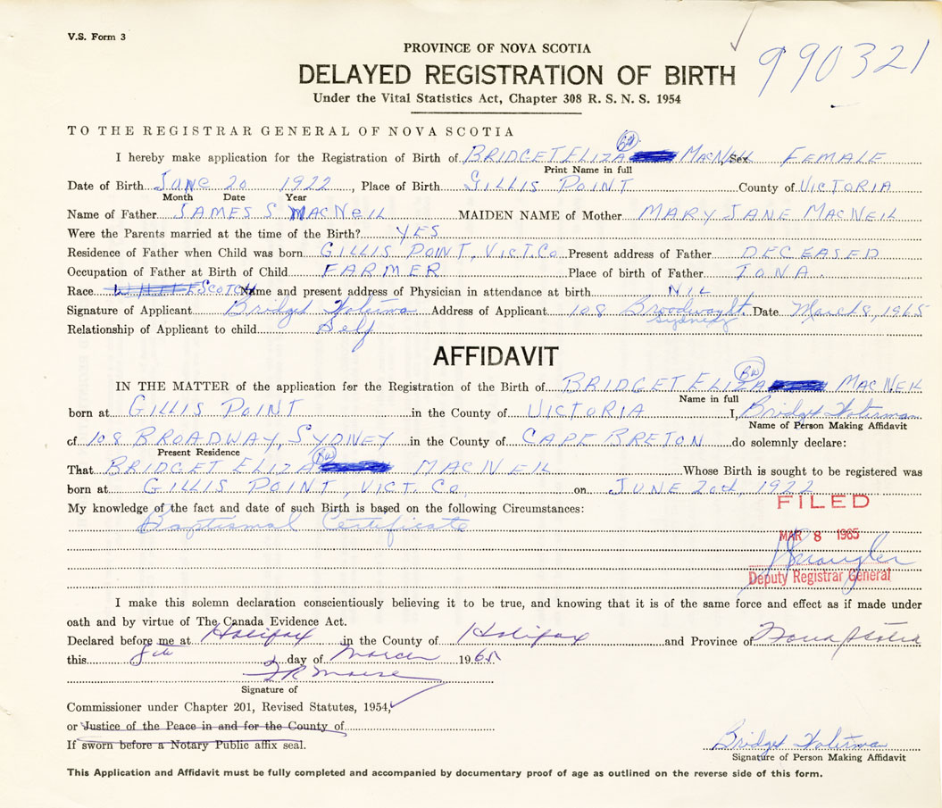 Name of Father James S. MacNeil MAIDEN NAME of Mother Mary Jane MacNeil
