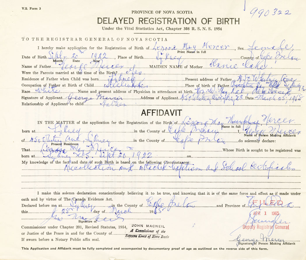Date of Birth September 20, 1922 Place of Birth SydneyCounty of Cape Breton