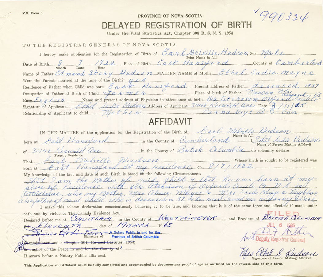 I hereby make application for the Registration of Birth of Earl MelvilleHudson Sex Male