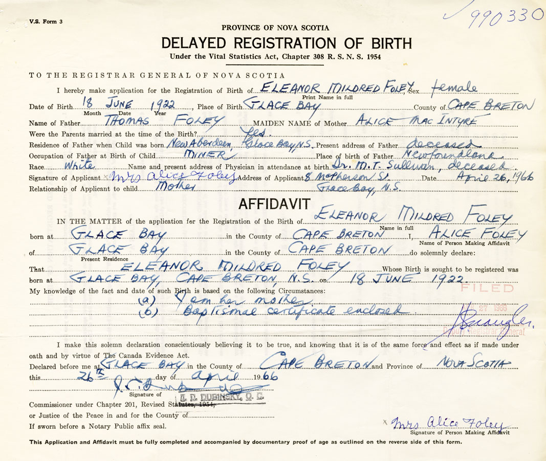Signature of Applicant Mrs. Alice Foley Address of Applicant 8 MacPherson Street, Glace Bay, Cape Breton Date 26 April 1966