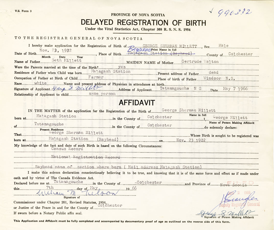 Signature of Applicant George S. Millett Address of Applicant Tatamagouche, Colchester Date 7 May 1966