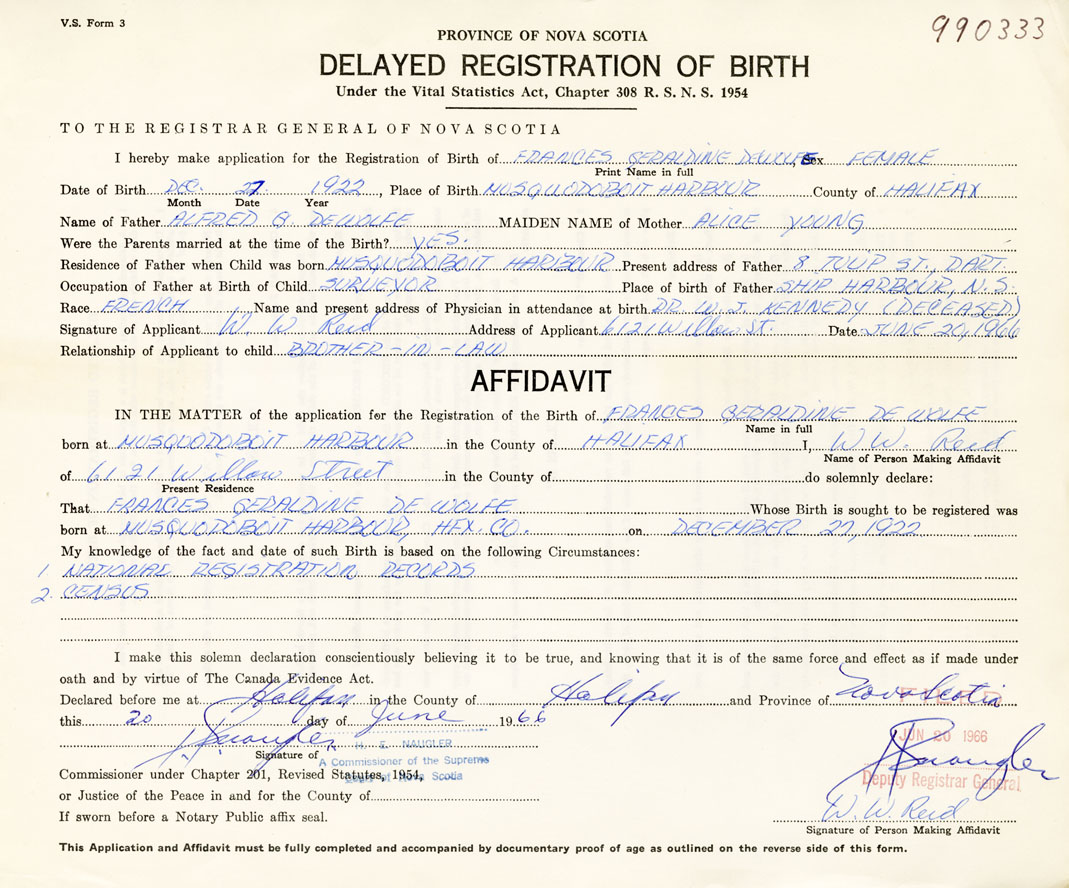 Date of Birth December 27, 1922 Place of Birth Musquodoboit HarbourCounty of Halifax