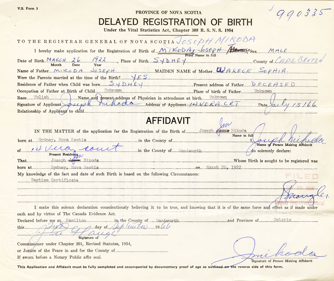 Signature of Applicant Joseph Mikoda Address of Applicant 14 Vera Court, Sydney, Cape Breton Date 15 July 1966