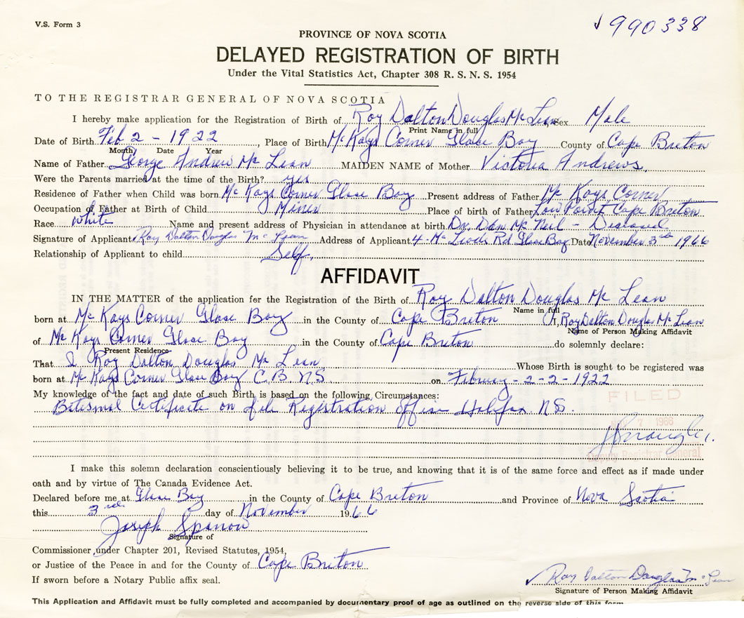 Signature of Applicant Roy Dalton Douglas McLean Address of Applicant 4 McLeods Road, Glace Bay, Cape Breton Date 3 November 1966