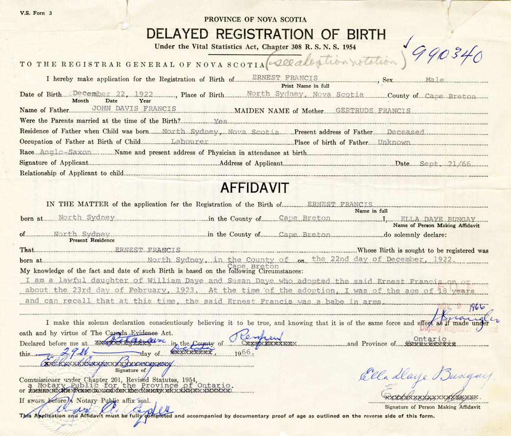Note: Adopted - Birth name was Ernest William Ervil Francis