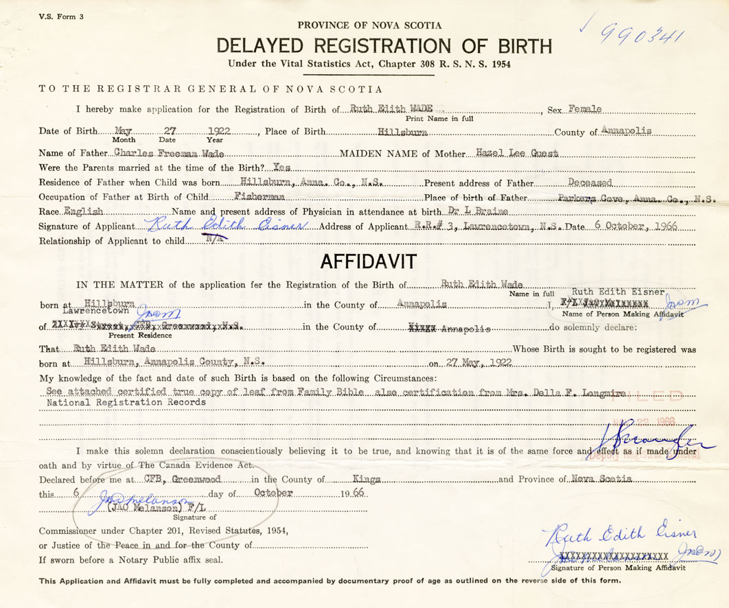 Signature of Applicant Ruth Edith Eisner Address of Applicant RR #3, Lawrencetown, Annapolis Date 6 October 1966