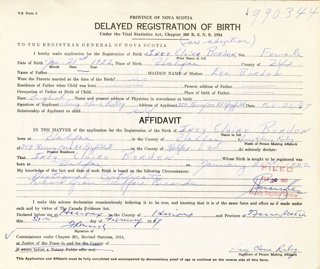 I hereby make application for the Registration of Birth of Inez ClaireBorden Sex Female
