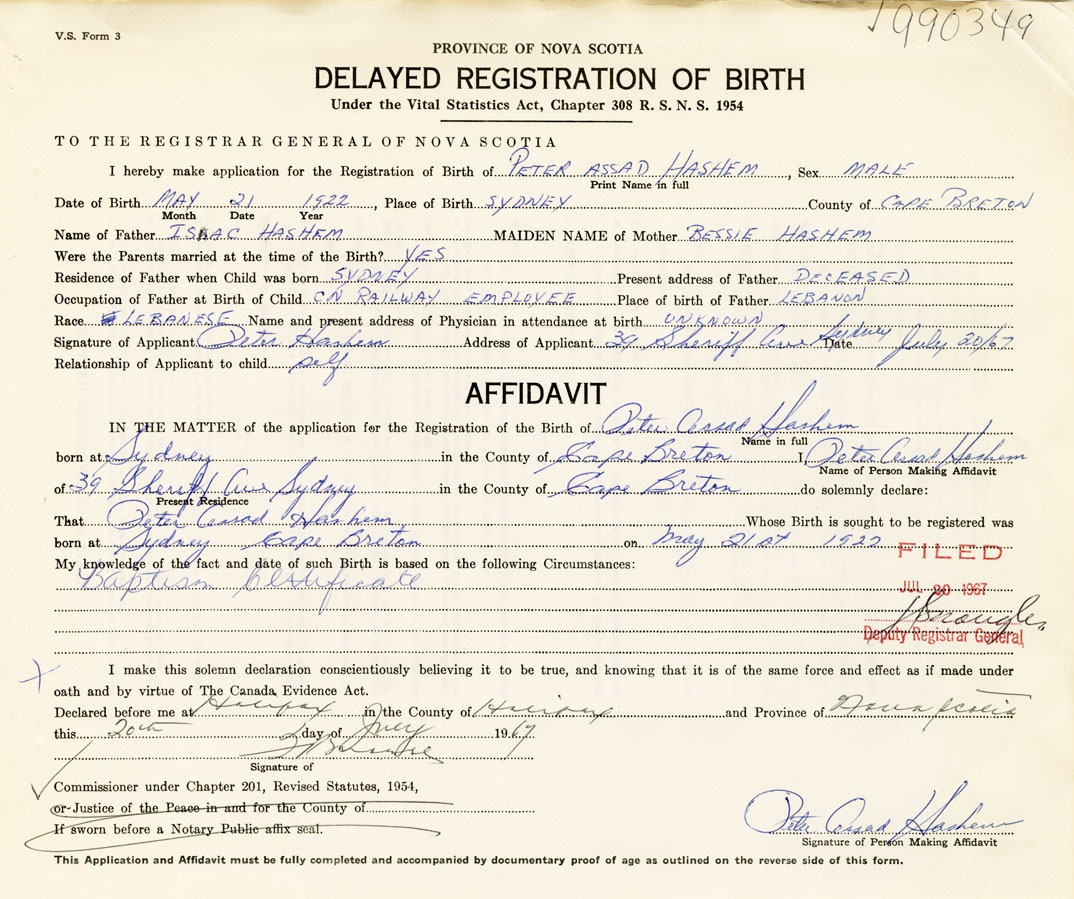 Signature of Applicant Peter Hashem Address of Applicant 39 Sherriff Avenue, Sydney, Cape Breton Date 20 July 1967