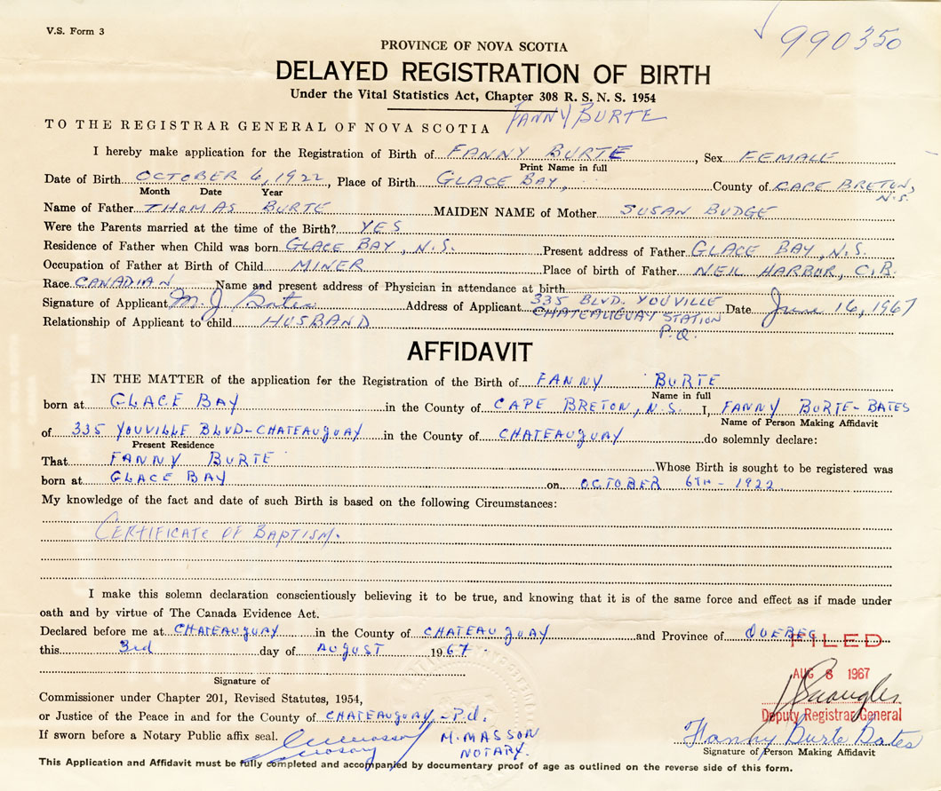 IN THE MATTER of the application for the Registration of the Birth of FannyBurte