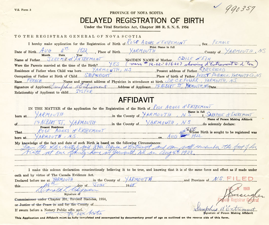 I am the older sister of said Rose Agnes d'Entremont and can well remember the fact of her birth at our family home in Yarmouth on August 4th, 1922.
