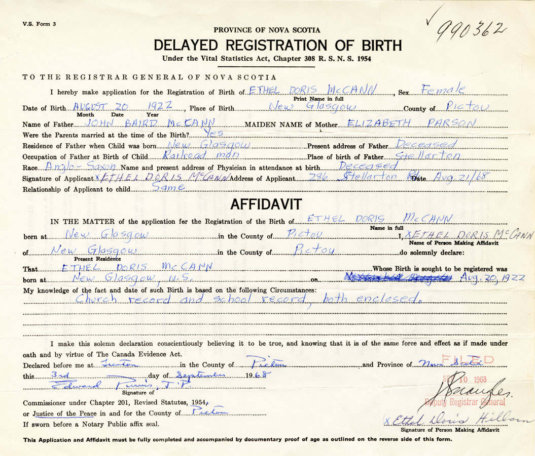 Signature of Applicant Ethel Doris McCann Address of Applicant 286 Stellarton Road, Pictou Date 21 August 1968