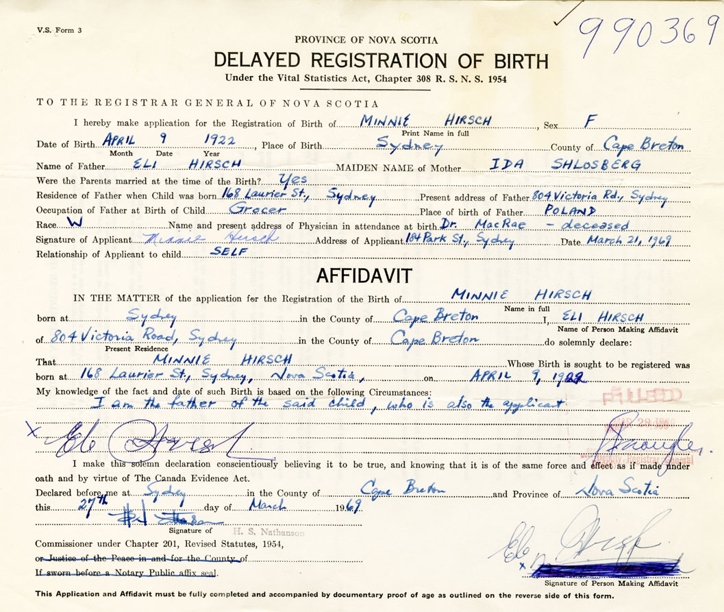 Signature of Applicant Minnie Hirsch Address of Applicant 184 Park Street, Sydney, Cape Breton Date 21 March 1969