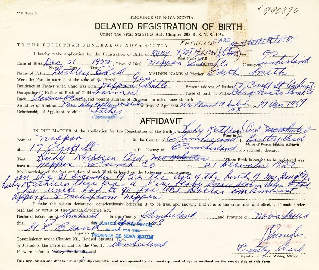On the 21 December 1922, the date of the birth of my daughter Ruby Kathleen, there was a very severe snow storm when I had to go for the doctor in Amherst approximately 5 miles from Nappan.