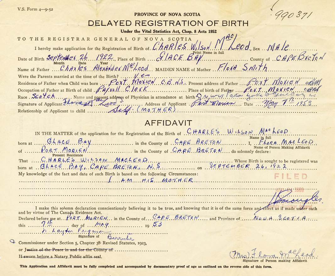 Signature of Applicant Flora MacLeod Address of Applicant Port Morien, Cape Breton Date 7 May 1953