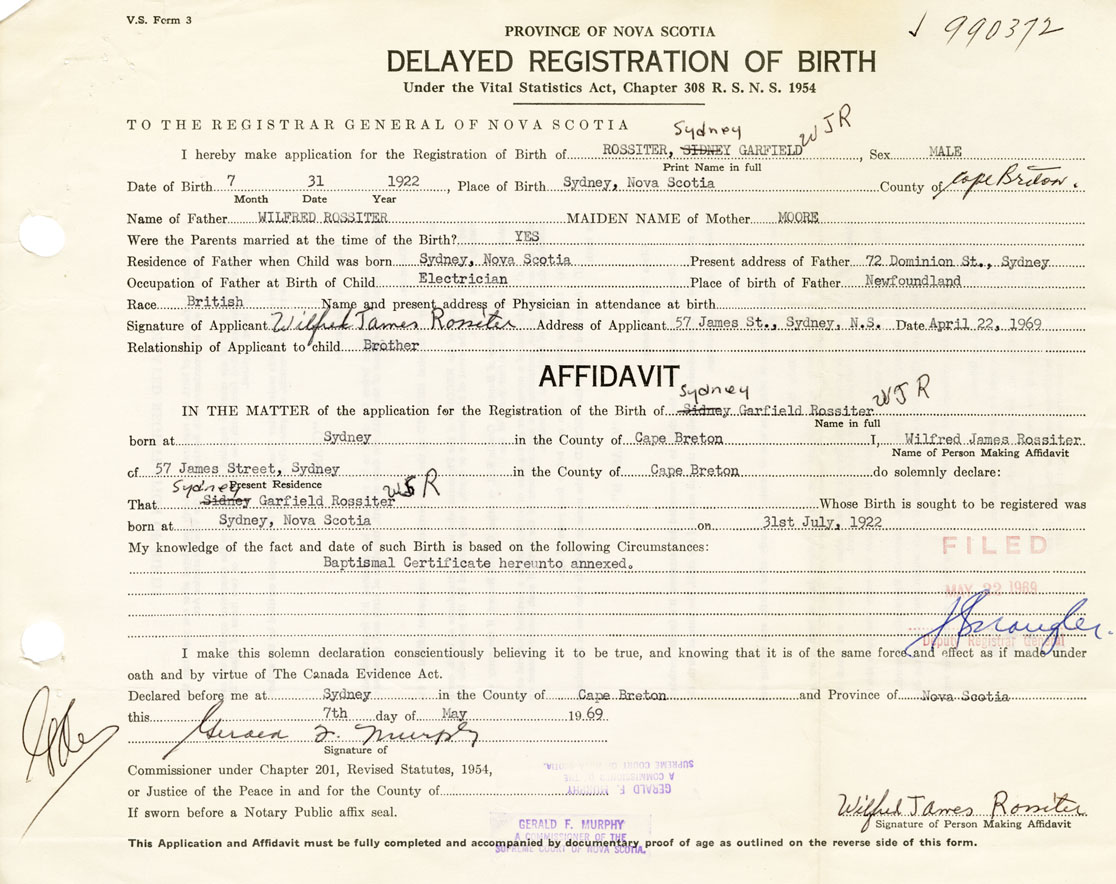 Signature of Applicant Wilfred James Rossiter Address of Applicant 57 James Street, Sydney, Cape Breton Date 22 April 1969