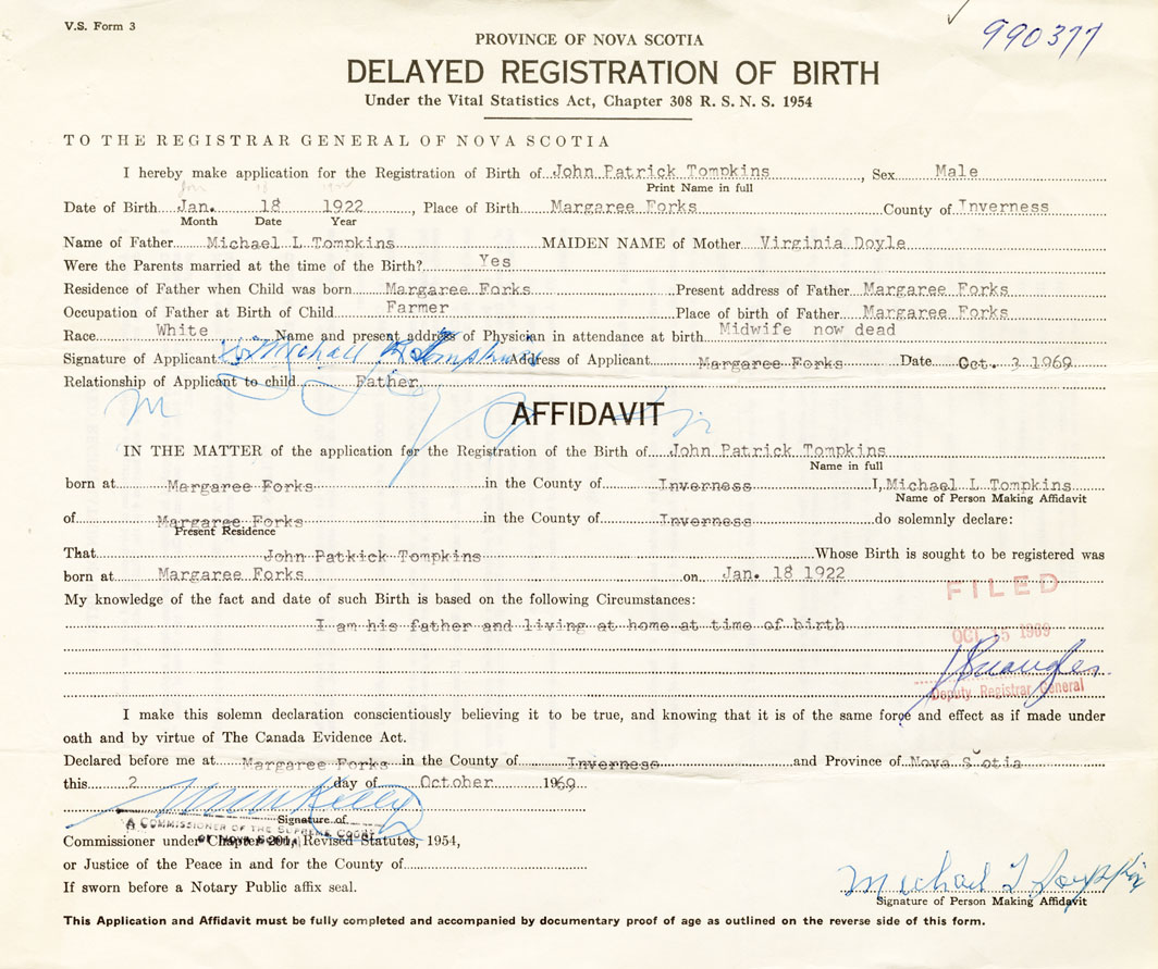 Date of Birth January 18, 1922 Place of Birth Margaree ForksCounty of Inverness