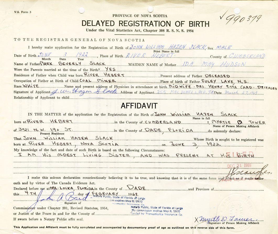Date of Birth June 3, 1922 Place of Birth River HebertCounty of Cumberland