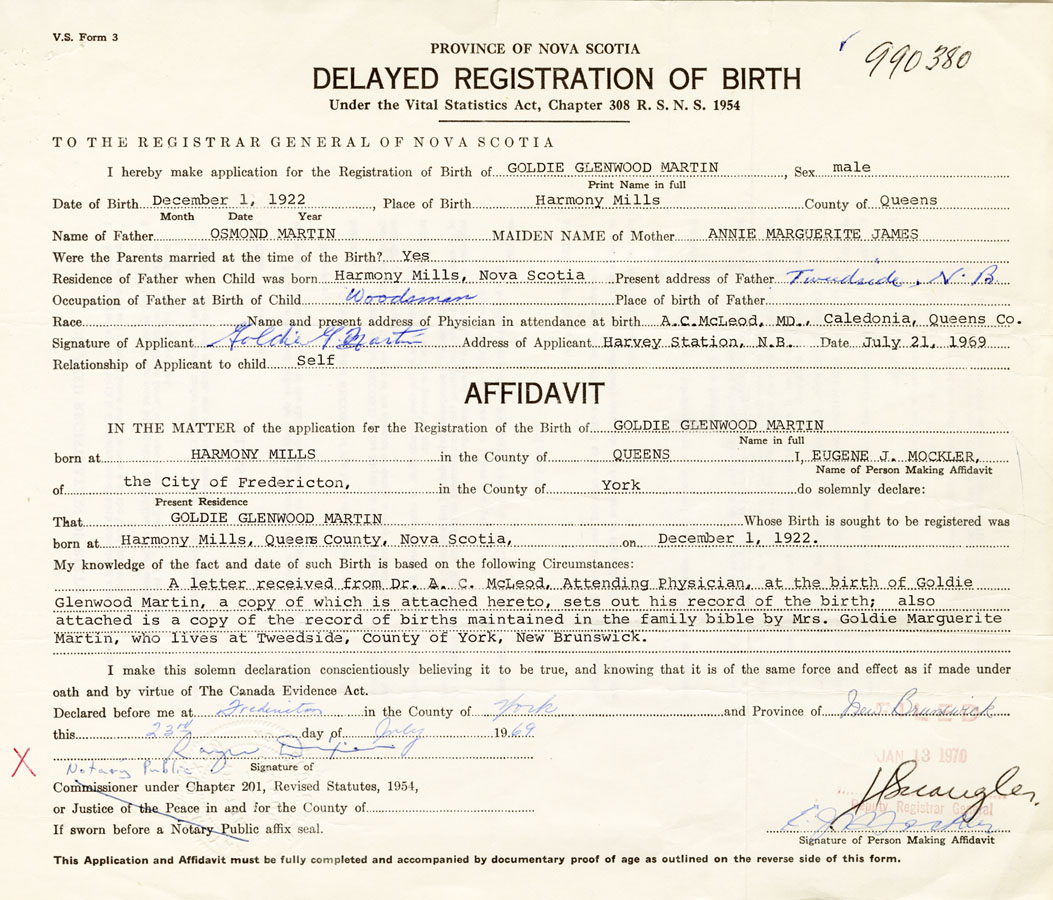 A letter received from Dr. A. C. McLeod, attending physician at the birth of Goldie Glenwood Martin, a copy of which is attached hereto, sets out his record of the birth; also attached is a copy of the record of births maintained in the family bible by Mrs. Goldie Marguerite Martin, who lives at Tweedside, County of York, New Brunswick.