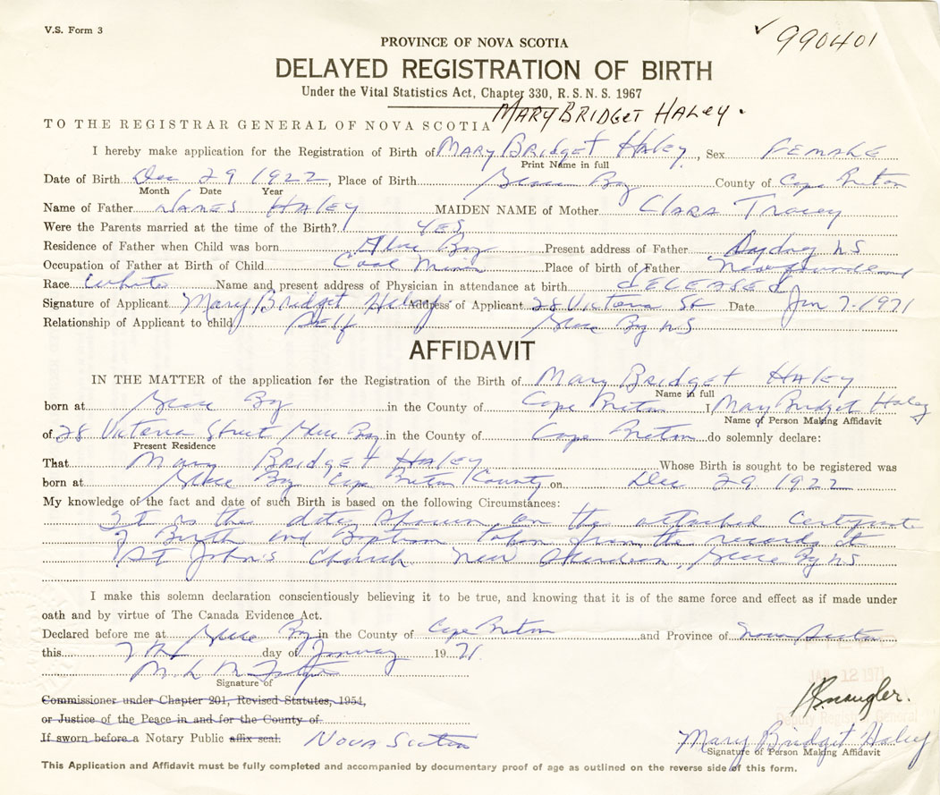 Signature of Applicant mary Bridget Haley Address of Applicant 28 Victoria Street, Glace Bay, Cape Breton Date 7 January 1971