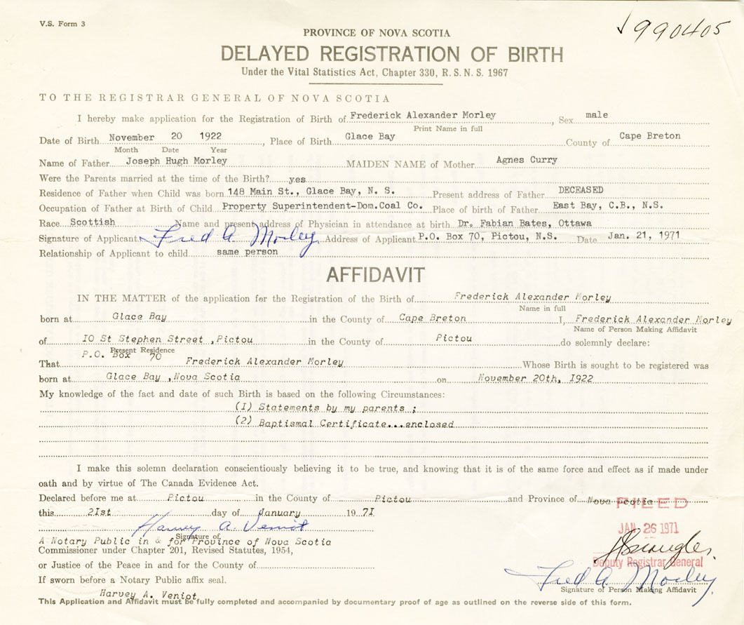 Signature of Applicant Fred A. Morley Address of Applicant PO box 70, Pictou Date 21 January 1971