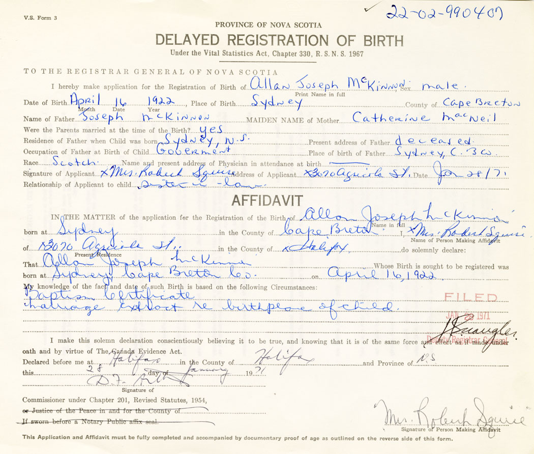 I hereby make application for the Registration of Birth of Allan JosephMcKinnon Sex Male