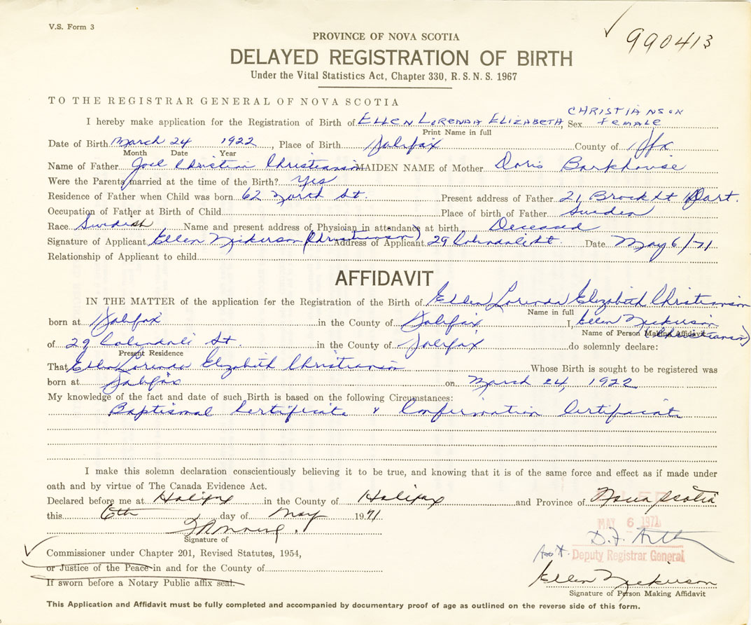 Signature of Applicant Ellen Nickerson Christianson Address of Applicant 29 Colindale Street, Halifax Date 6 May 1971