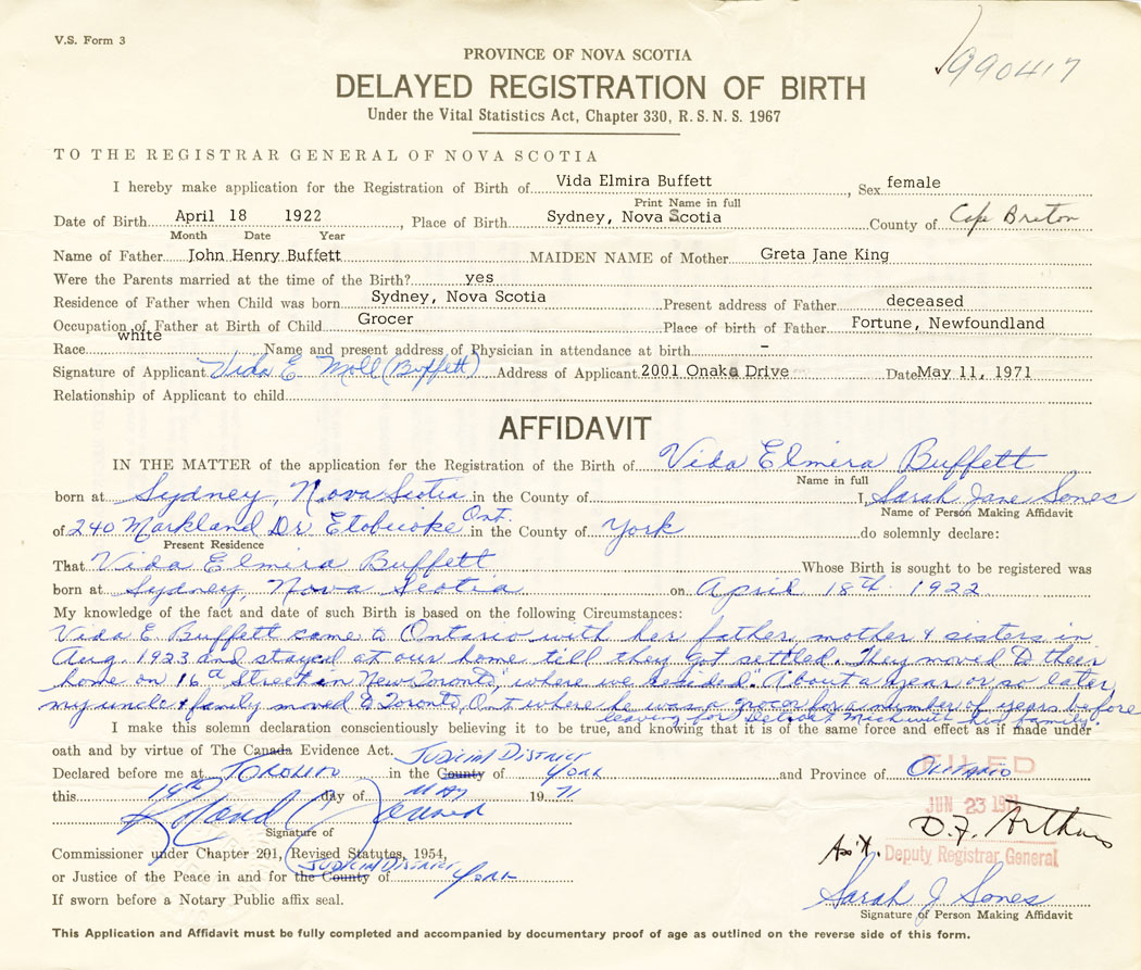 I hereby make application for the Registration of Birth of Vide ElmiraBuffett Sex Female