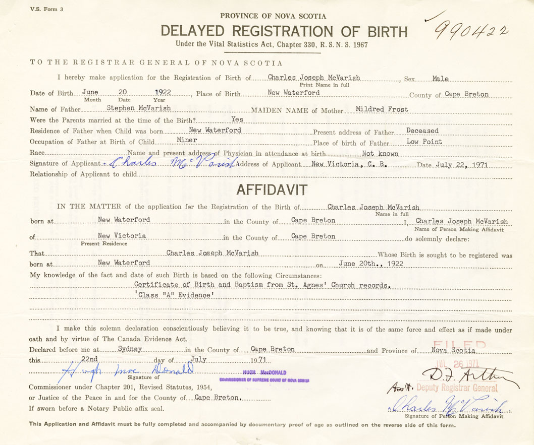 Signature of Applicant Charles McVarish Address of Applicant New Victoria, Cape Breton Date 22 July 1971