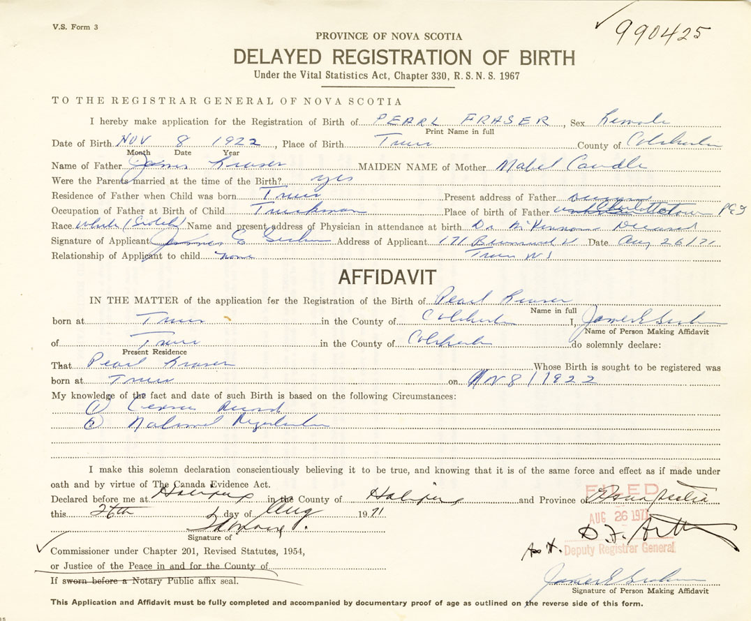 I hereby make application for the Registration of Birth of PearlFraser Sex Female