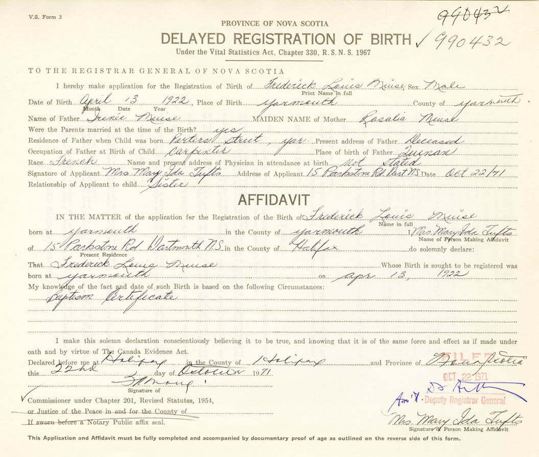Date of Birth April 13, 1922 Place of Birth YarmouthCounty of Yarmouth